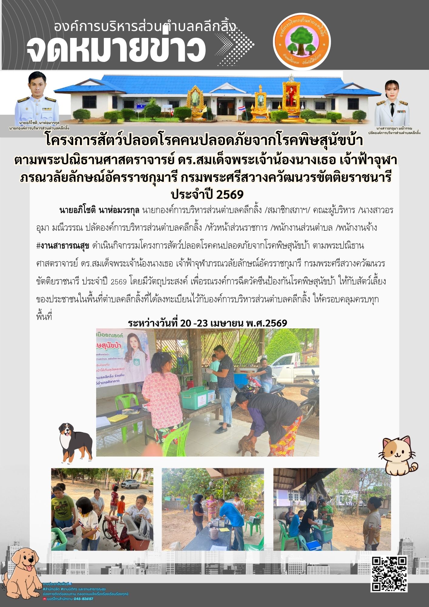 กิจกรรมโครงการสัตว์ปลอดโรคคนปลอดภัยจากโรคพิษสุนัขบ้า ตามพระปณิธานศาสตราจารย์ ดร.สมเด็จพระเจ้าน้องนางเธอ เจ้าฟ้าจุฬาภรณวลัยลักษณ์อัครราชกุมารี กรมพระศรีสวางควัฒนวรขัตติยราชนารี ประจำปี 2569 โดยมีวัตถุประสงค์ เพื่อรณรงค์การฉีดวัคซีนป้องกันโรคพิษสุนัขบ้า ให้กับสัตว์เลี้ยงของประชาชนในพื้นที่ตำบลคลีกลิ้งที่ได้ลงทะเบียนไว้กับองค์การบริหารส่วนตำบลคลีกลิ้ง ให้ครอบคลุมครบทุกพื้นที่
